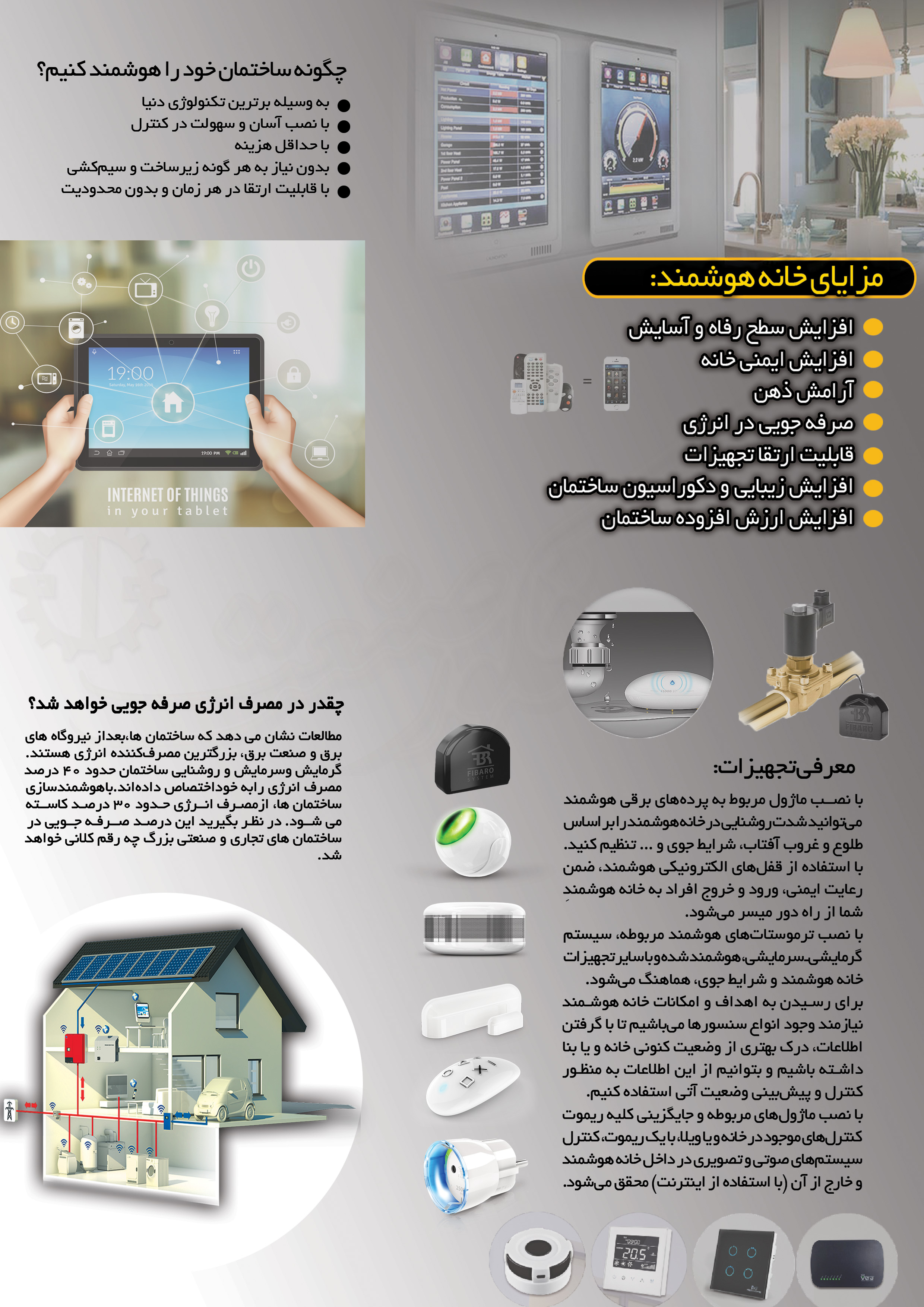 کنترل اتوماتیک دما ، روشنایی ، انواع در ها، سیستم سرمایش و گرمایش ، سیستم صوت و تصویر ، سیستم آبیاری باغپه و مزارع از طریق ریموت و موبایل (SMS ، اینترنت ، وایفا) از هر مکانی در دنیا